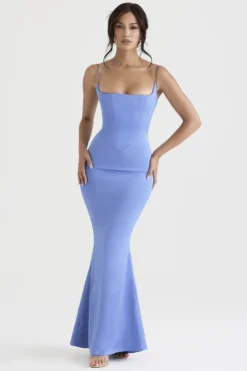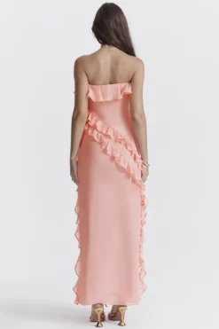 The neckline features a delicate frill trim and it drapes effortlessly over your curves with a dramatic high split to reveal a flash of leg in a floaty finish. It’s fully lined for comfort and zips up the left side for easy on. Wear yours with our ‚Lucent‘ mules.