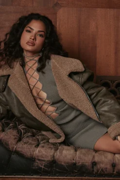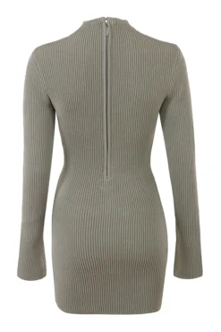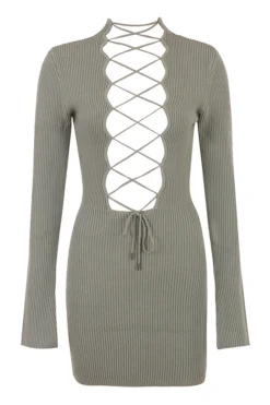 Designed to highlight your curves, our ‚Jada‘ dress is knitted from our extra special tension rib knit fabric with flexible ribs that stretches for comfort and the striking open neckline showcases and flatters the bust. The lace up front self ties to customise the fit and the long sleeves balance the mini hem perfectly, making ‚Jada‘ a fall season favourite. It has a zip to the back for easy on and we love the artichoke hue paired with our ‚Paris‘ brown patent heels.