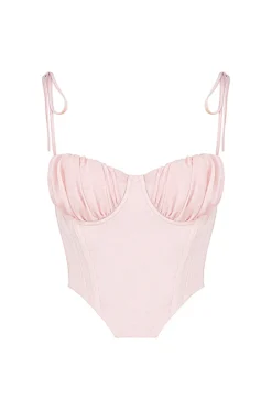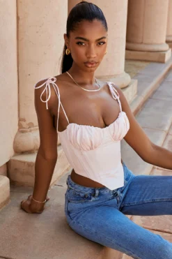 The pretty baby pink hue makes ‚Willow‘ ultra girly and a joy to wear. It’s made from a lightweight chiffon and boned down through the bodice to snatch the waist. The underwired, gathered cups add such a pretty feminine touch with satin shoulder ties to customise the fit. ‚Willow‘ is fully lined for comfort and has a zip to the back for easy on. Compliment the cropped hem with our ‚Antonia‘ High Waist Wide Leg Jeans. As corsets are designed to fit snugly, we recommend sizing up if you are between sizes.