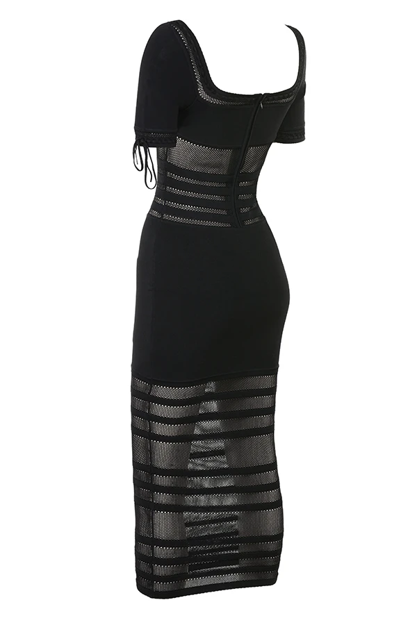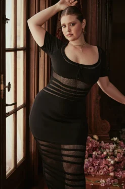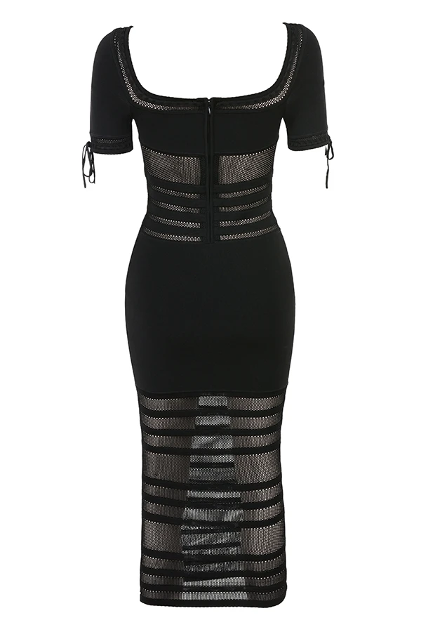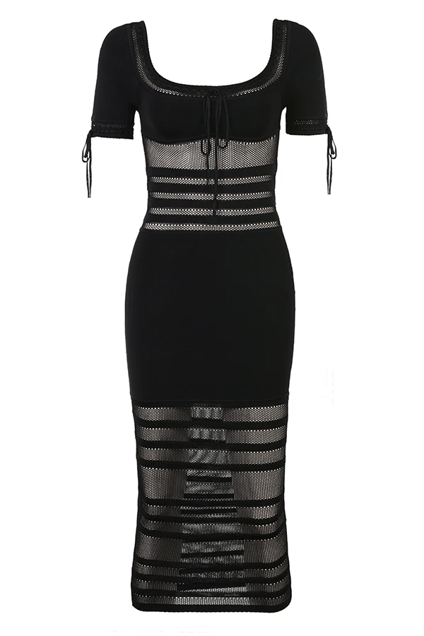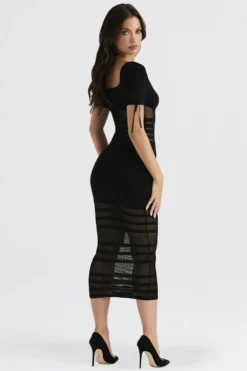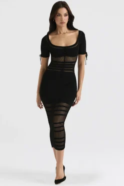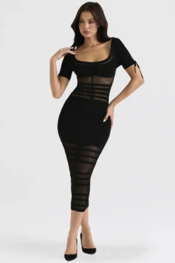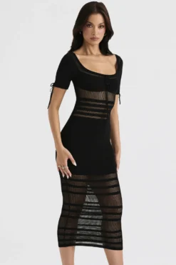 Cut from our luxury knit that’s blended with plenty of stretch in timeless black, our ‚Lilla‘ midi dress is ultra feminine. It’s pencil silhouette features a low rounded neckline with a rouleau tie to the front and elongated short sleeves.