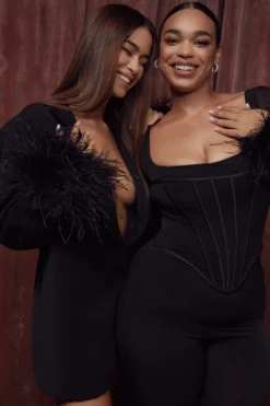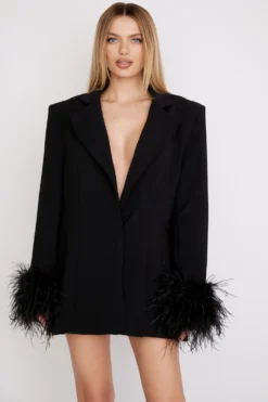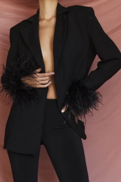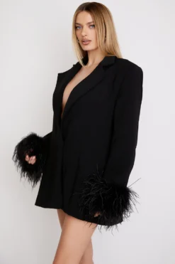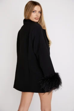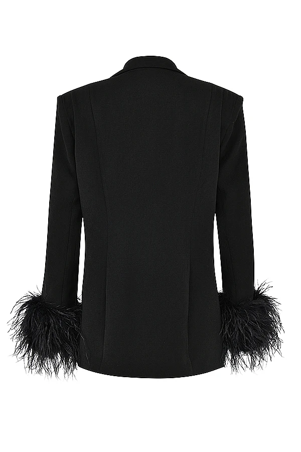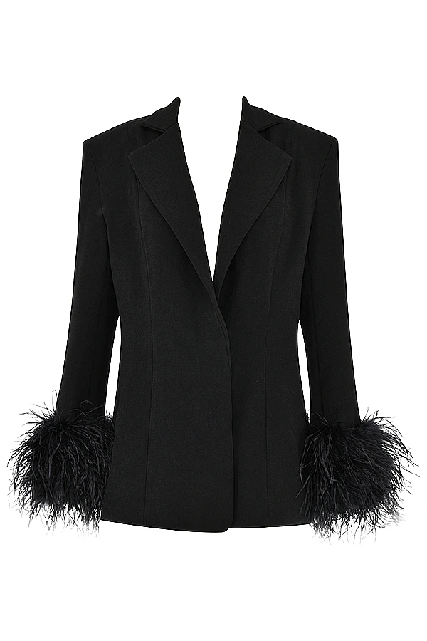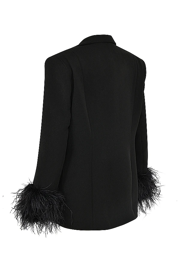 The padded shoulders are added for structure and we love the dramatic yet elegant feather trim cuffs for the perfect finish. It is fully lined in a soft satin for smooth layering. Wear yours with anything from party dresses to wearing alone or elevate your jeans and a tee.