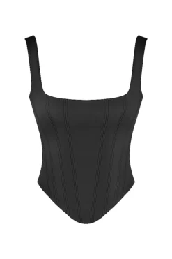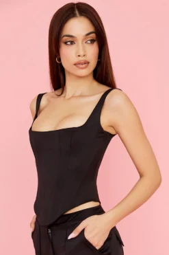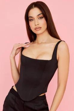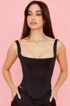 Rafa‘ is beautifully crafted from our ultra luxe and lustrous duchess satin in classic black that we love paired with black trousers or denim. Inspired by traditional corsets, ‚Rafa‘ has a longline silhouette that dips below the natural waistline with a bust flattering square neckline and features our incredible corsetry boning to really cinch the figure in for an ultra feminine hourglass shape.