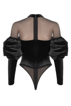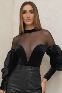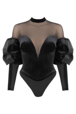 Our ‚Monique‘ bodysuit has an ultra feminine and sexy vibe. It’s cut from a super soft plush velvet with long dramatic puffy sleeves to the top of the arm and then fitted below the elbow. The bodice is perfectly boned for ultimate support through the ultra plunging v-shaped neckline so there’s no need for a bra as you have all the support you need. We love the feminine vibe of the sheer tulle to the bust and around to the back. It zips through the back for easy on wear. The bodice is fully lined in stretch crepe and the briefs are lined in our super soft power mesh thats shapes from within like a built in shapewear and the thong style is designed for a seam free finish. Wear yours with our ‚Saffy‘ Black vegan leather trousers and stiletto heels.