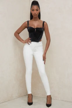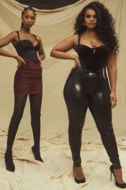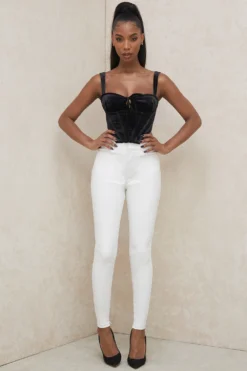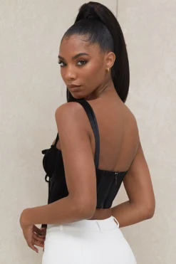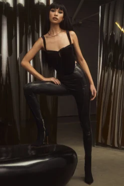 The ‚Aayla‘ bustier top encapsulates all that House of CB is known for luxurious fabrics and precise construction. Cut from luxurious plush velvet, in wear-with-anything black, it has a corseted bodice and a tie front. It is fully boned internally and has lightly padded cups for support. The cropped hem is perfect with our latex pants or a high waist skirt