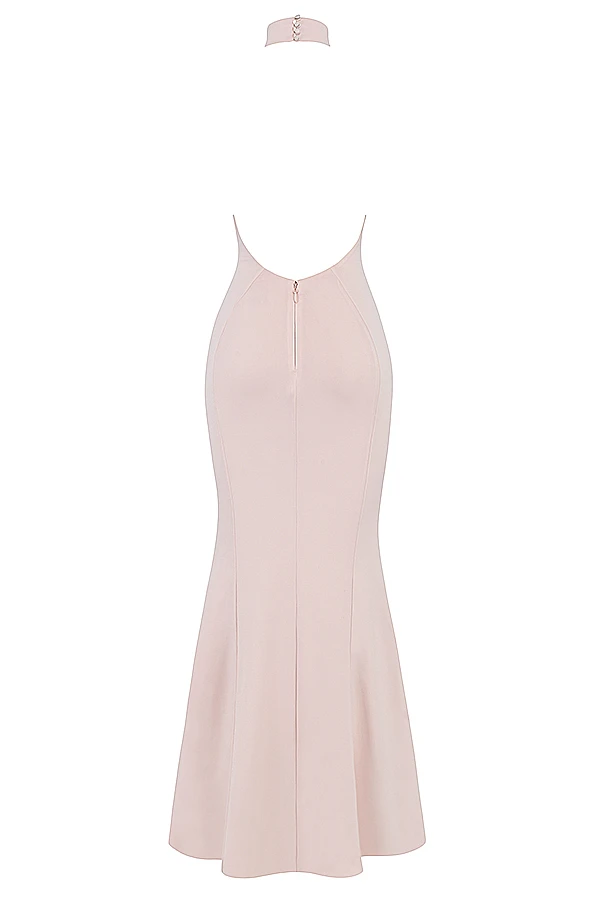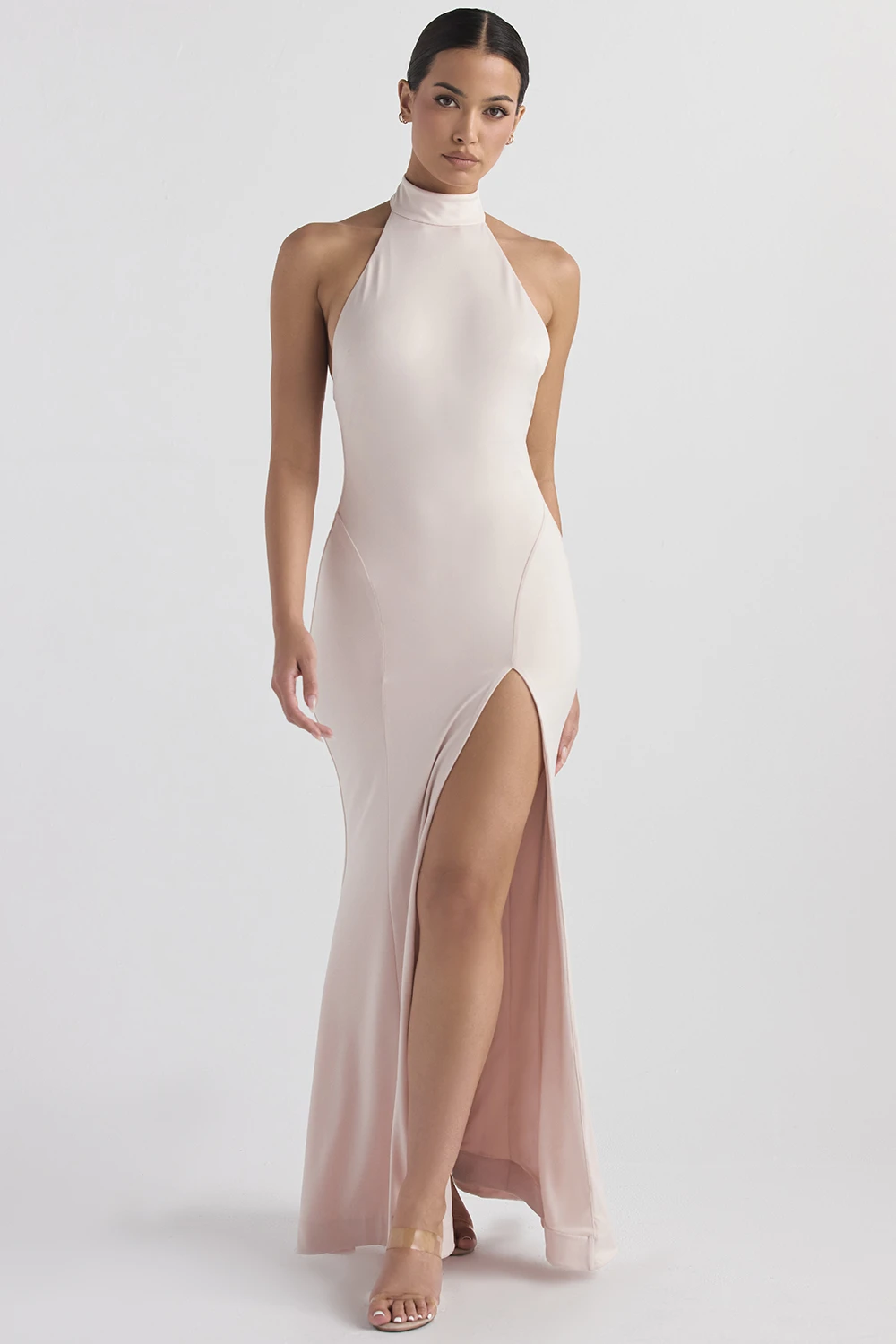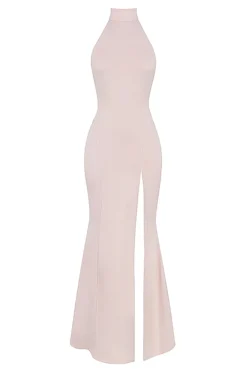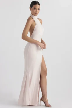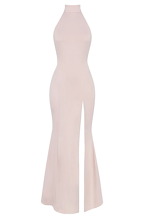 Our ‚Juliette‘ dress is chic and elegant. It sweeps the floor in a flattering maxi length, cut from our softest stretch jersey in a beautiful Blush hue. It has a sleek high halter neck in a sleeveless design and turns to reveal an open back. We love how the contouring seams define the shape as it skims over your curves before flaring out from the knee to a dropped fishtail silhouette.