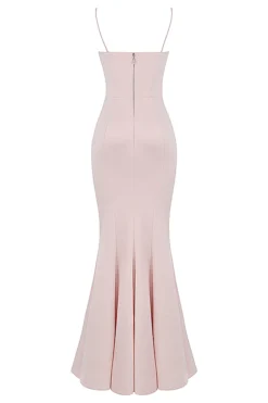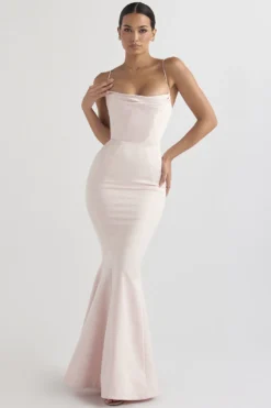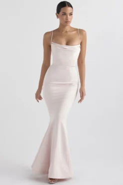 Our ‚Violette‘ dress has been designed with high octane glamour at its core. Cut from our ultra luxe and lustrous duchess satin in a beautiful Blush hue, ‚Violette‘ has a draped neckline and ultra fitted corset to cinch your waist. The fishtail skirt is ultra flattering to exaggerate your curves as you walk.
