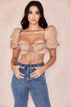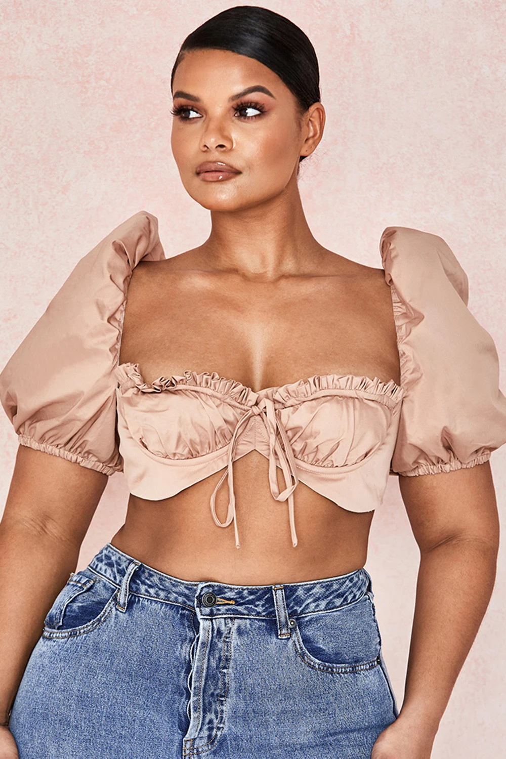 Cut from our crisp stretch cotton poplin, ‚Hedy‘ is just a vision. It has a cropped fit and fabulously feminine cut with prettily gathered, underwired cups. The puff sleeves are ultra gorgeous and remain in shape due to internal stabilizers. The cups are lightly lined for comfort and this can be worn without a bra due to the built-in underwire.