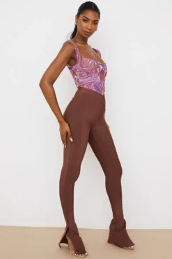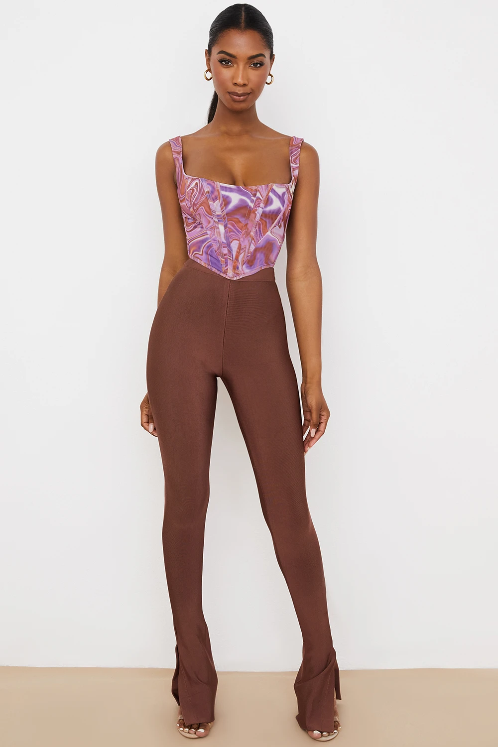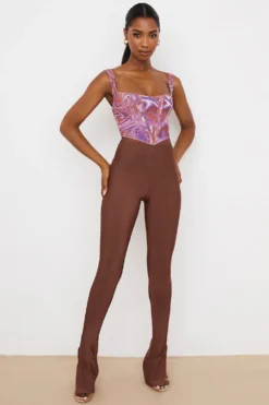 We love the second skin fit through the legs that fall to split flared hems that will sit perfectly over killer heels and think they look great teamed with our ‚Livia‘ Toffee Satin Peplum Corset for a gorgeous tonal vibe. They have a zip to the back for easy on. Taller girls, we heard you and these are available in two lengths, Regular: 105cm and Longer: 109cm