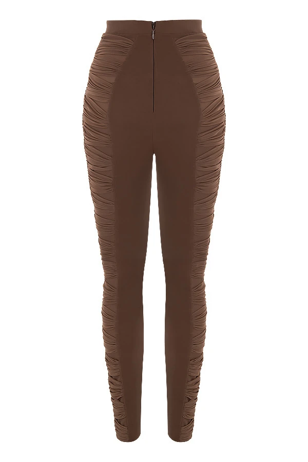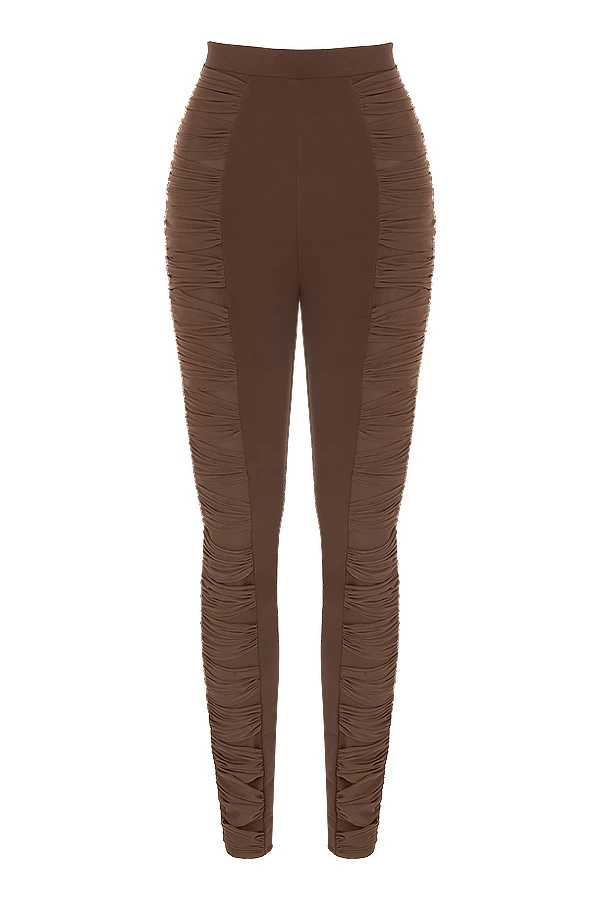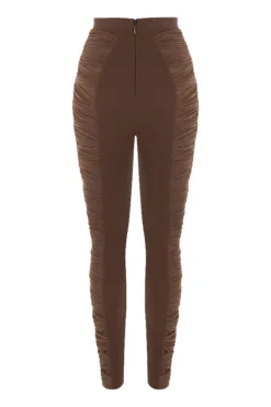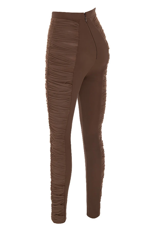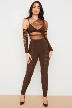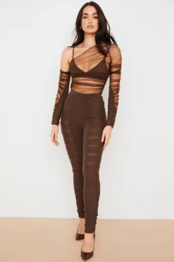 We love the side panels that are slightly sheer to reveal a glimpse of skin and gathered in a soft mesh that twist down through the front of the leg. Wear yours with our ‚Delia‘ Ruched Mesh Asymmetric Bralette Bodysuit for a head turning date night.