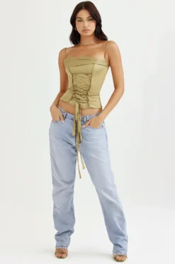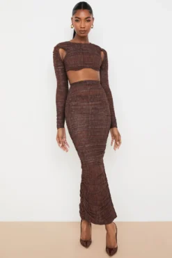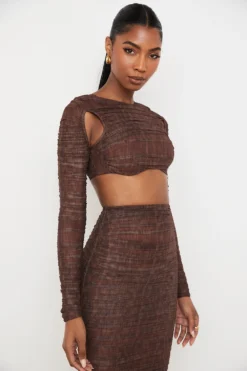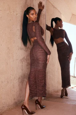 We love how the underwired cups peep just below the cropped hem and the side corsetry boning to snatch and add extra support. It has a zip to the back for easy on. Wear yours with our matching ‚Laverne‘ Chocolate Print Ruched Maxi Skirt as our designers intended for a super cute put together look.