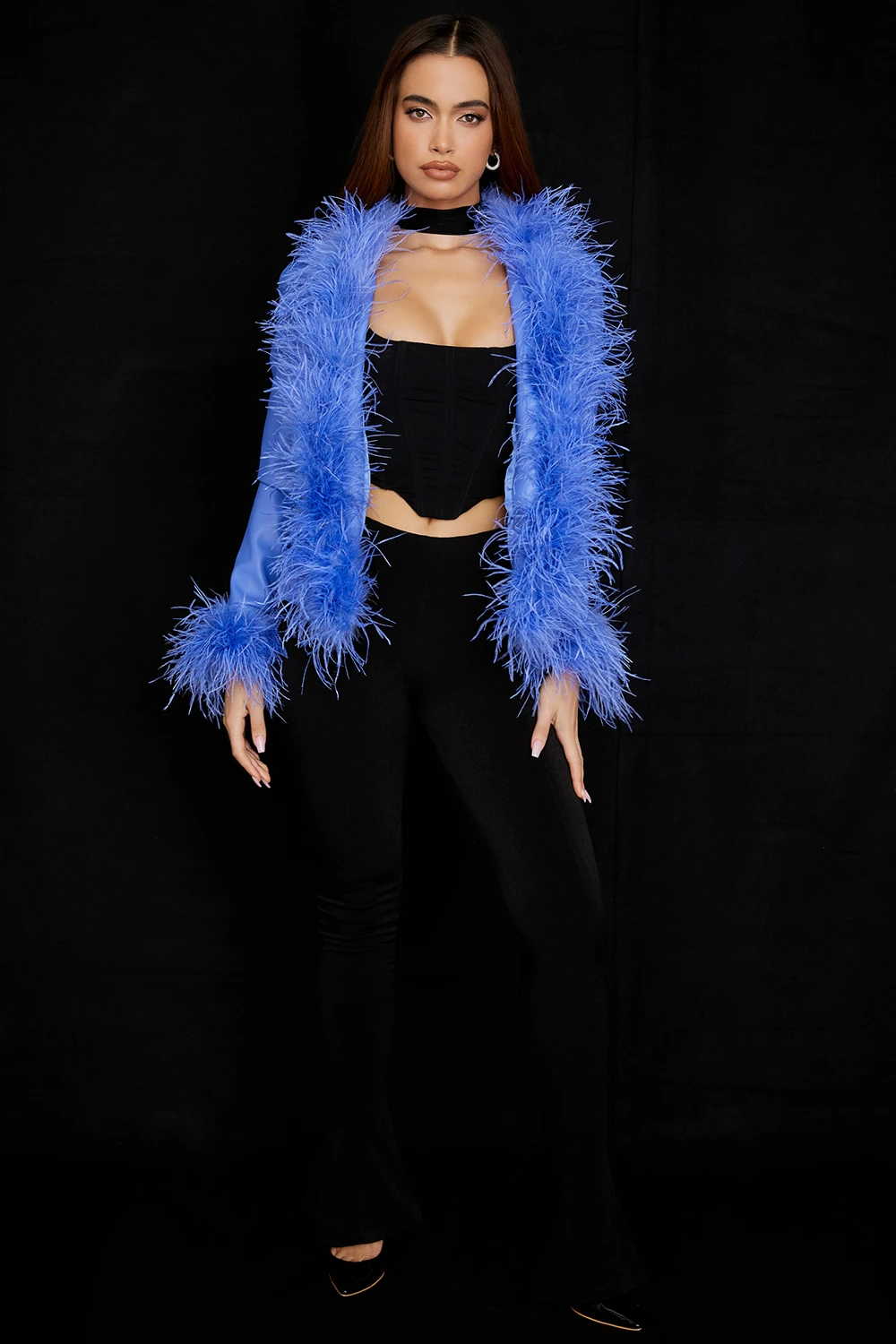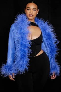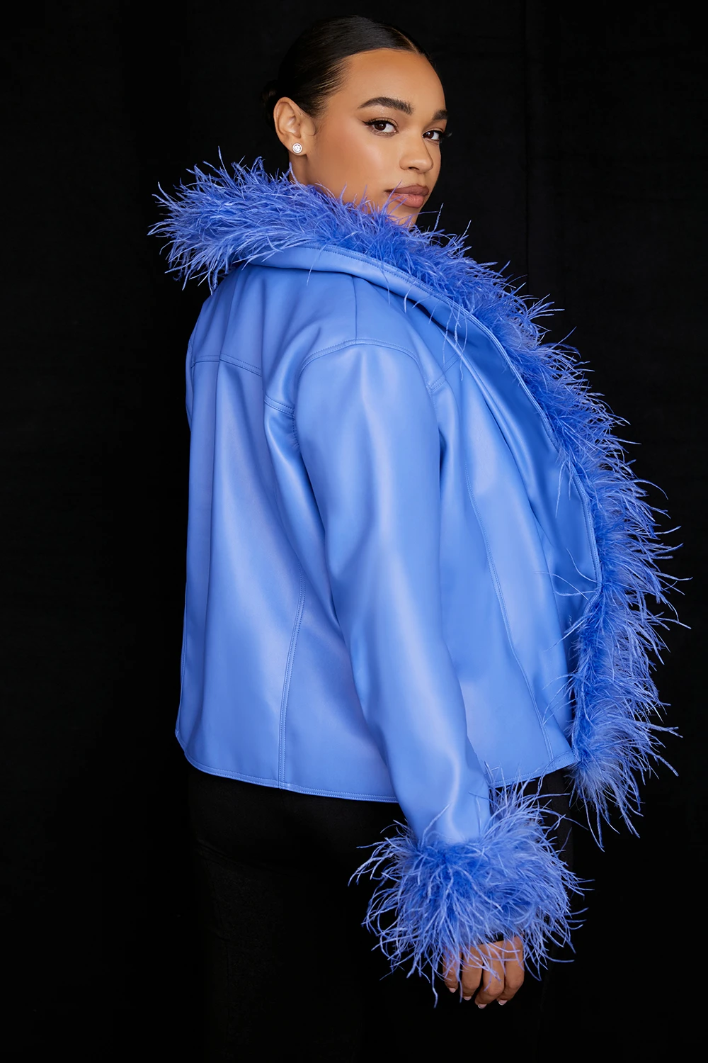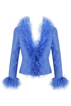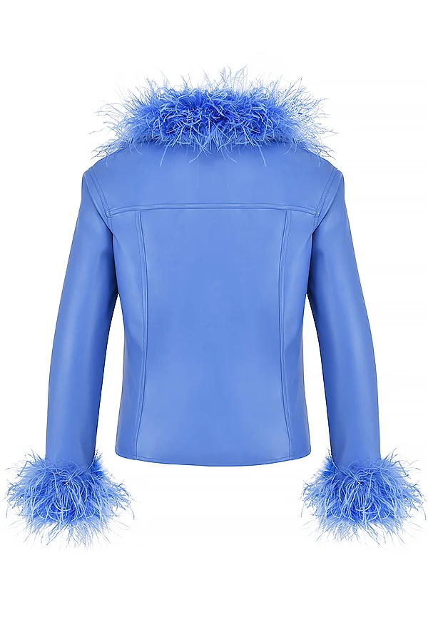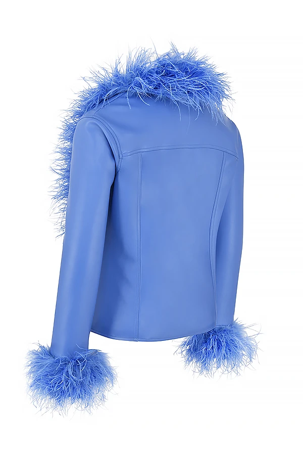 Our ‚Salome‘ jacket will be your prettiest jacket to date, with bright tones and an ultra glam feel. ‚Salome‘ is cut from the softest vegan leather in a striking cornflower blue and designed to nip in at the waist with a one button fastening and exposed seams for a tailored fit. We love the tonal feather trim to the open collar and cuffs for a touch of romance. It’s fully lined to ensure smooth layering. Wear yours over denim or a classic midi dress like ‚Misty‘.