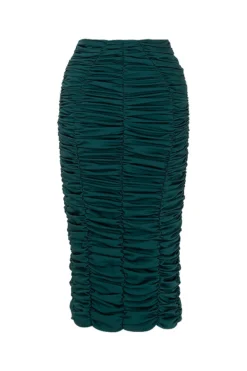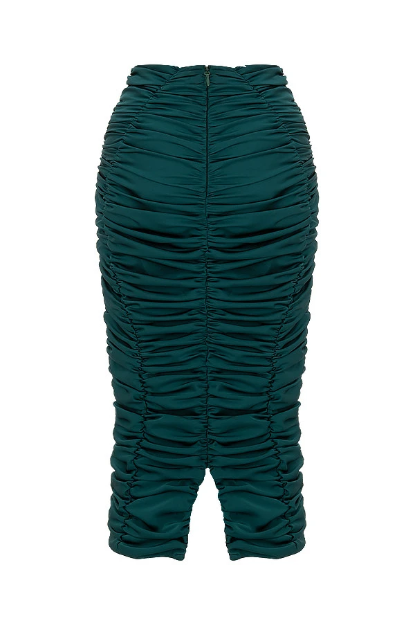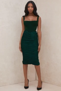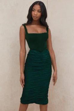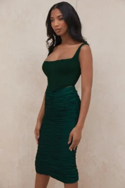 Cut from our light and silky satin in a deep evergreen tone, ‚Mera‘ has a stretch satin lining to hug your figure and really cinch your waist. It has a flattering midi cut and sits at the natural waist. We love the seamed ruching details and the split to the back for easy movement and think that this looks perfect with black or neutral sandals such as ‚Barefoot‘ and the ‚Trixie‘ corset bodysuit.