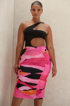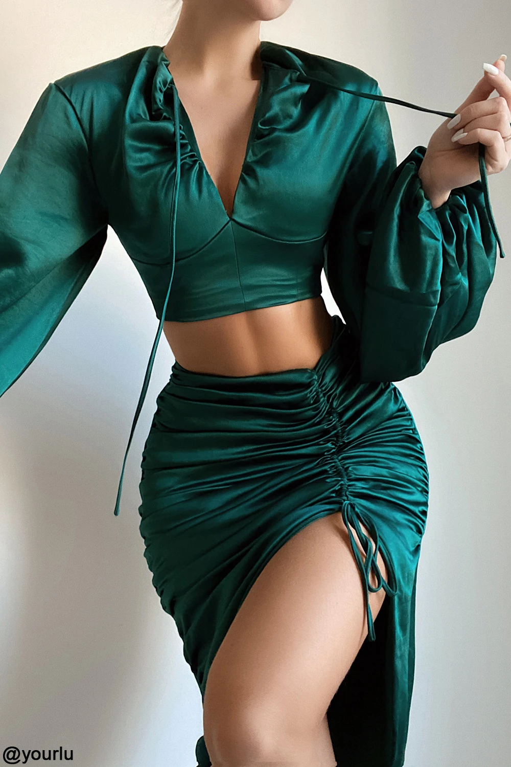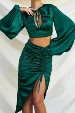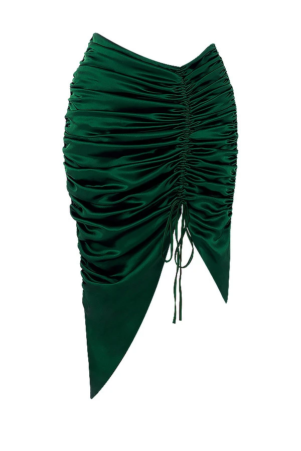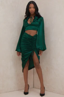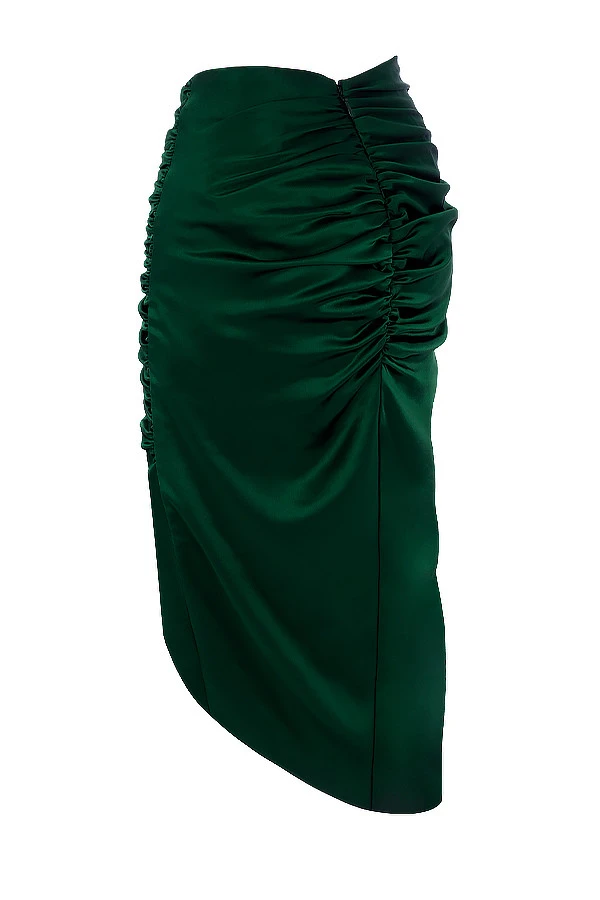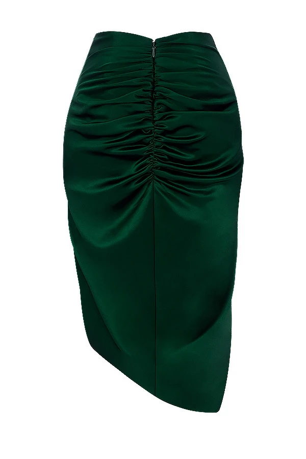 ‚Petronella‘ is the skirt of the season. Its the perfect figure hugging creation in a festive deep emerald green tone. It’s cut from our most luxurious duchess satin in a close fitting asymmetric design that really flatters your curves. The front is gathered by a drawstring channel at the front side, creating the high split that flashes a generous amount of thigh that sexily parts as you walk. We love the way the high waistline dips at the side and the gathering at the back for the ultimate flattery. It is fully lined in a stretch satin for a smooth and comfy finish and has a zip to the back for easy on. Wear with our ‚Vandra‘ balloon sleeve top as our designers intended for those festive winter date nights.