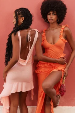 Soft and romantic, Pixie is one of our favourites in our Summer collection. Cut from our floaty georgette in a flame orange hue, ‚Pixie‘ has a flattering plunge neckline and is traced with flouncy ruffles.Â