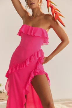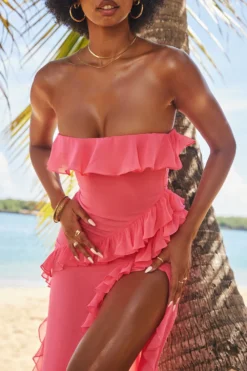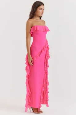 The neckline features a delicate frill trim and it drapes effortlessly over your curves with a dramatic high split to reveal a flash of leg. It’s fully lined for comfort and zips up the left side for easy on. Wear yours with our ‚Lucent‘ mules.