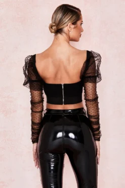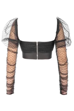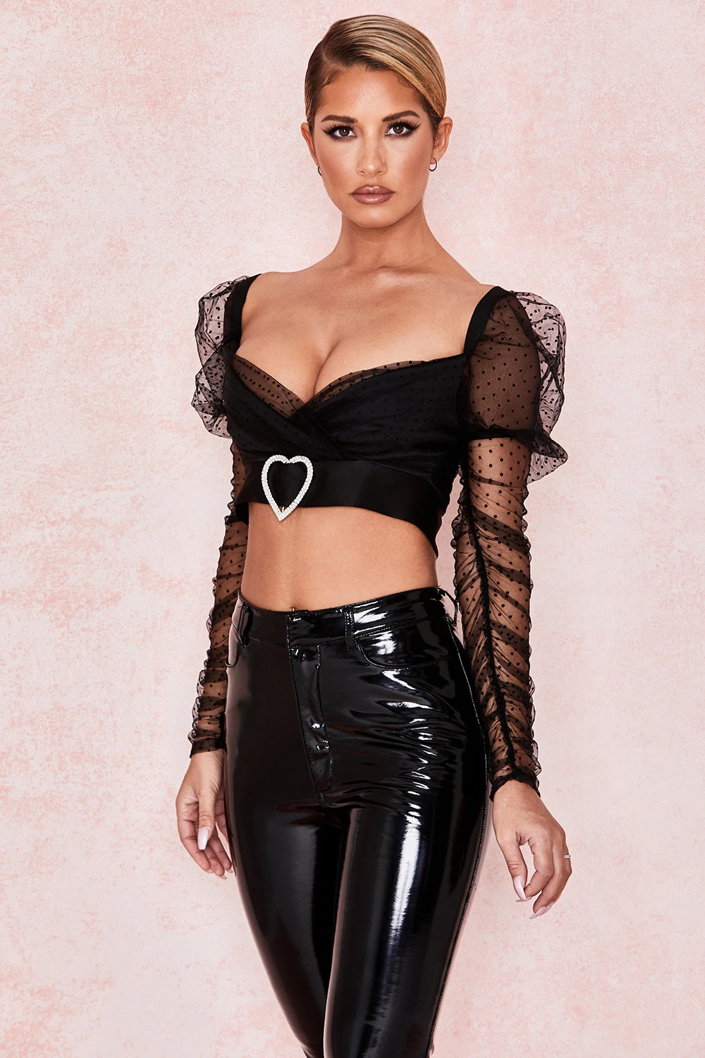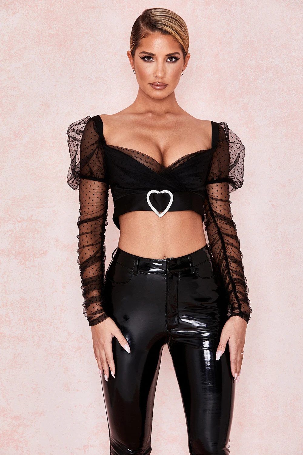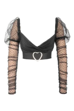 This whimsical and feminine top has been cut from the prettiest dotty gathered mesh. It has long sleeves and pretty puff sleeves and crosses at the bust in a dainty crystal heart. The bodice is lined and it zips to the back for easy on. The underbust band has a crystal heart detail and we love this teamed with denim or glossy pants.