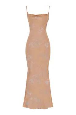 Our ‚Gabrielle‘ dress is nothing short of glamorous and is sure to generate endless compliments. Cut from a beautiful floral georgette in an iridescent CafĂ© Au Lait tone that flatters all skin tones. It has a flattering cowl neckline and gently gathered at the bodice to accentuate the fit.