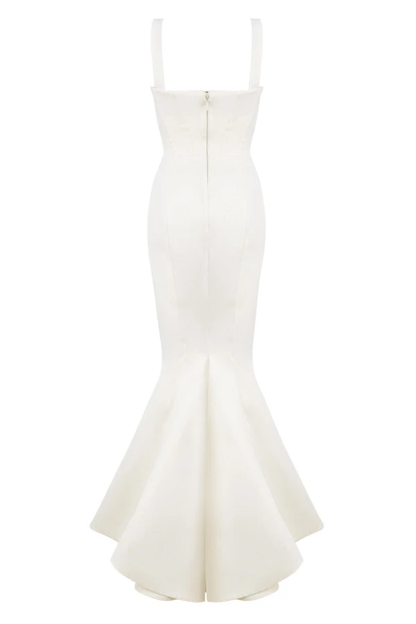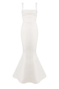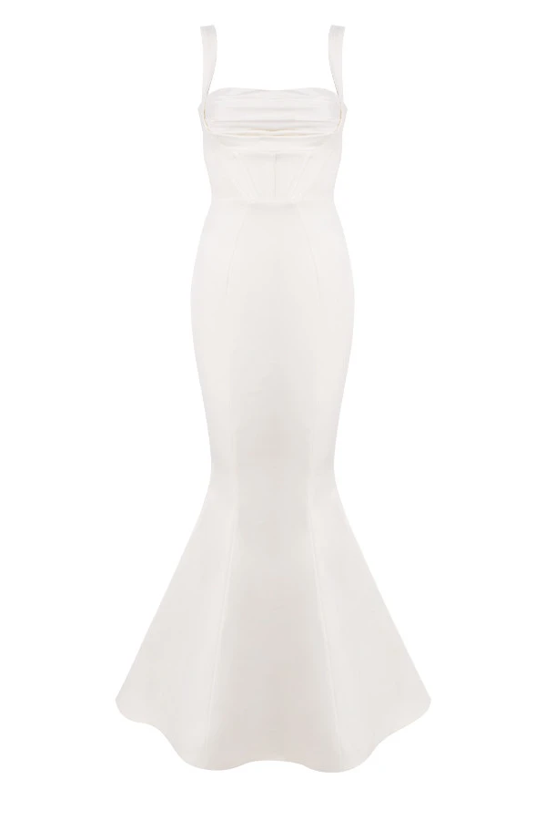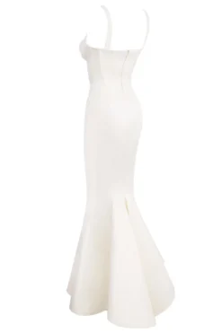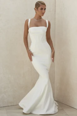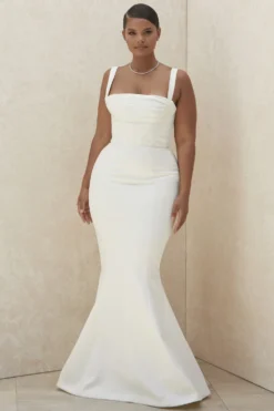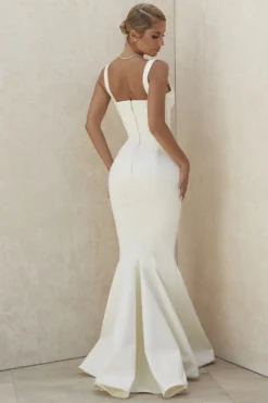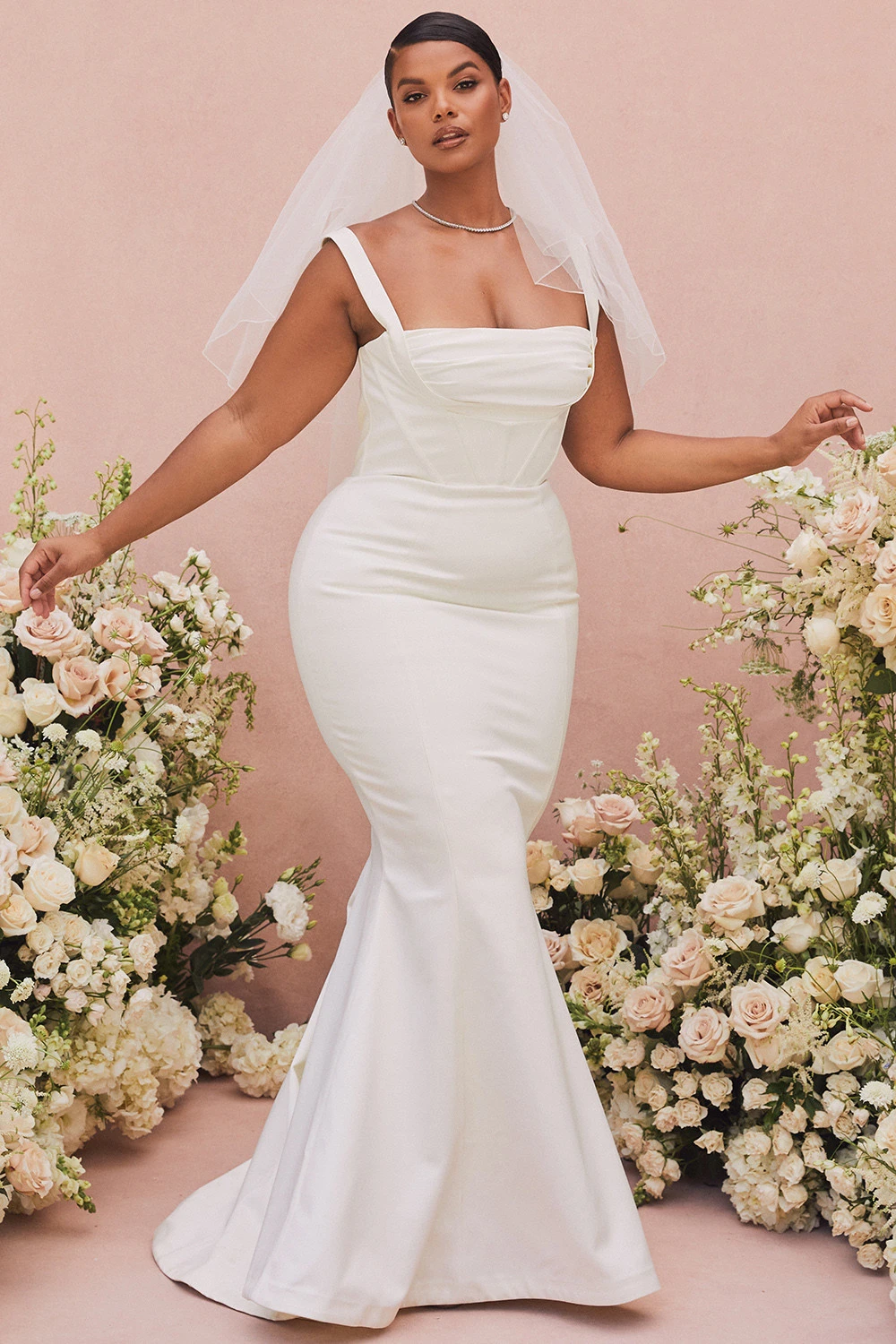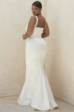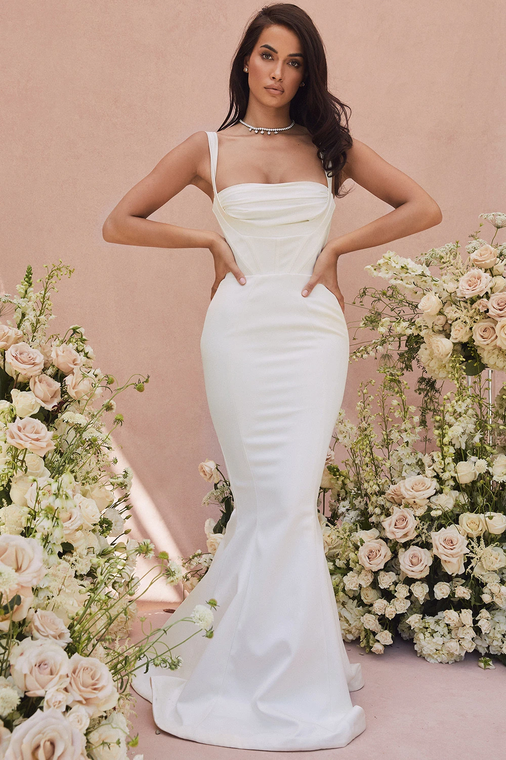 Our love for corsetry is well known and here we have combined our classic bodice corsetry with the most feminine of balconette cuts. The balconette is oh-so-flattering and the shaped straps that round the shoulders finish this elegant and feminine look. ‚Francoise‘ is fashioned from our lustrous luxurious and heavyweight Duchesse satin that cinches right in at the waist and the corsetry continues through to the back of the bodice. The skirt is fitted over the hips and falls away to a gentle flare from the knees. The classic Godet train glides gracefully nehind as you walk.