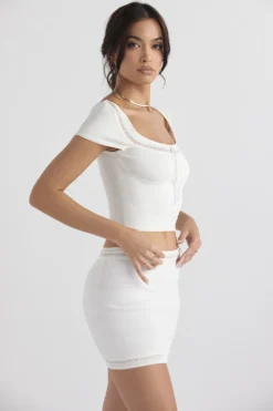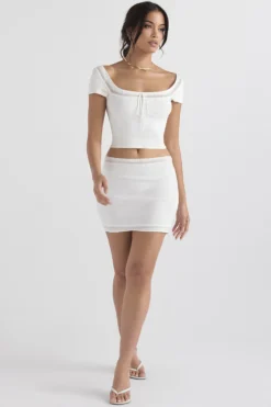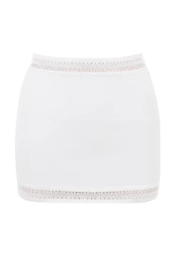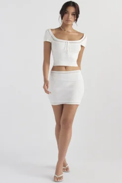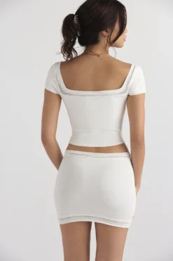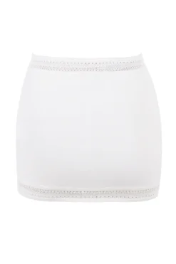 Our ‚Sarelle‘ mini skirt is so cute and dainty. Cut from our new luxury custom made smooth knit in delicate ivory that’s blended with generous stretch for an ultra comfortable fit. ‚Sarelle‘ has a pretty openwork trim detail to the waist and hem and fits close to the body to hug your curves in a pull on style. Wear yours with the matching ‚Nola‘ top and high heels like ‚Lola‘ in white for a fresh summer vibe.
