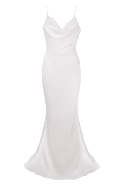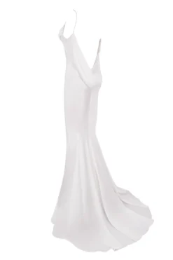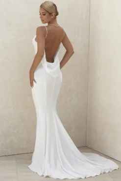‚Aurelie‘ is all about encapsulating an ethereal mood. In lustrous satin, the front drapes languidly into a flattering cowl and the bias cut caresses the curves, turning to reveal a low low open draped back that shows off a generous amount of skin. It’s supported by pin thin rouleau straps that hook around the shoulder and give the whole dress a delicate and romantic feel. The soft ivory hue complements all complexions and the skirt falls away into an elegant sweep train that grazes the floor as you walk down the aisle. Wear yours with barely there sandals such as ‚Ghost‘.