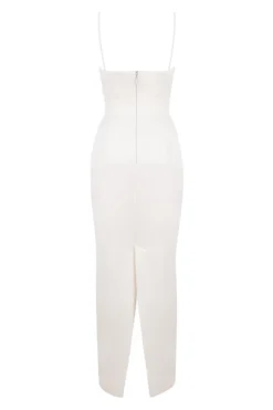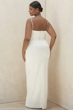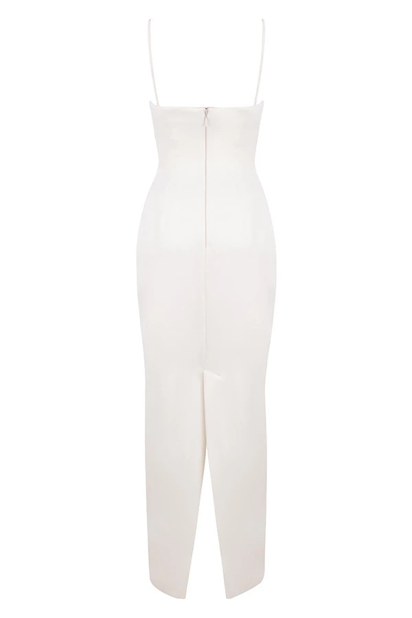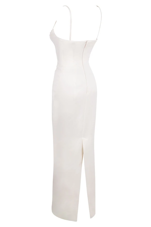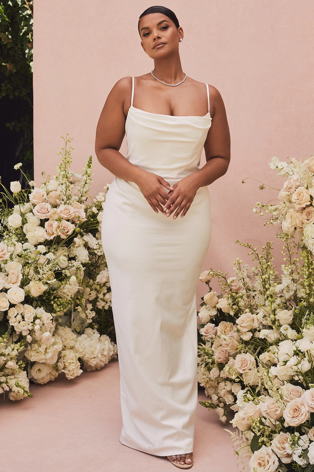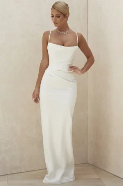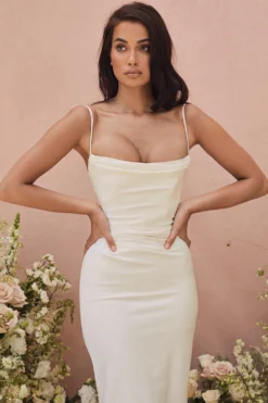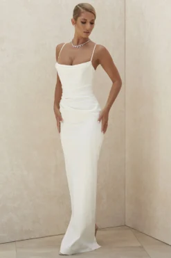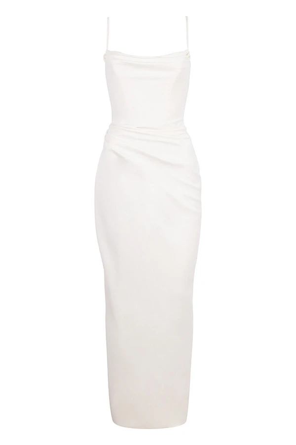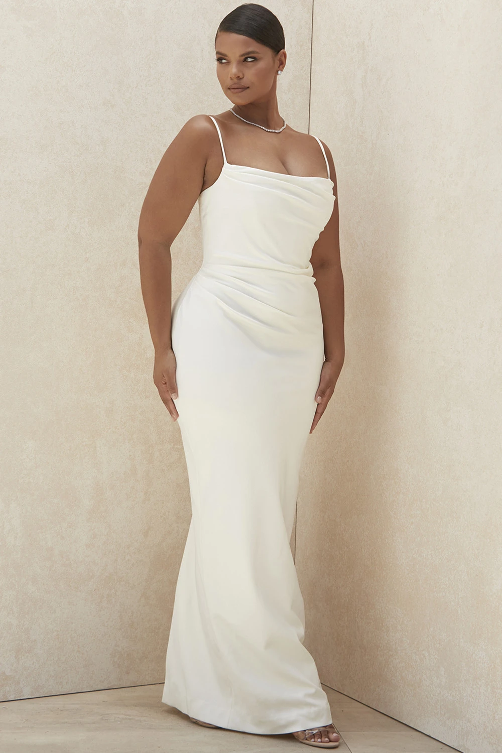This beautiful gown puts the focus firmly on elegant draping to craft an exquisite silhouette. The neckline, slender straps and clever hip draping come together to create this simple yet showstopping gown that’s all underpinned with expert corsetry to the lining layer. The sheath skirt grazes the floor and the back vent allows for ease of movement