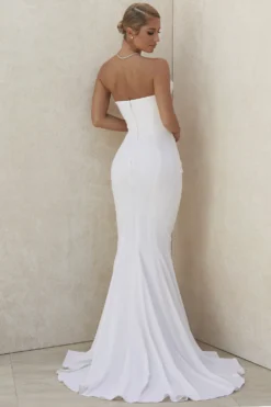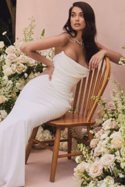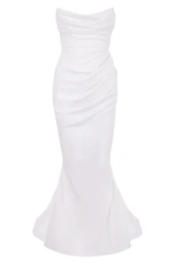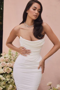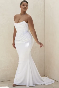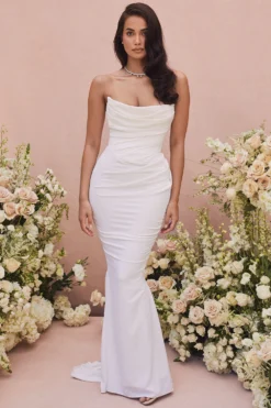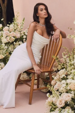 The elegant draping of ‚Esmee‘ is truly a masterpiece. It’s made from a lustrous smooth satin that’s draped around a fully corseted bodice for the ultimate in cinching and support. The structured sweetheart neckline is ultra flattering and the inner layers are corseted to the hilt for maximum support and lift. The beautifully draped skirt falls away to a sweep train to add further drama to your entrance. Add delicate sandals in White like our ‚Marivel‘ and a dainty veil.