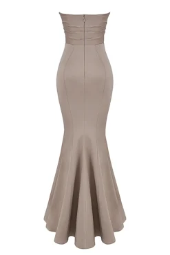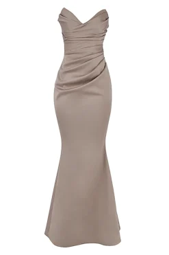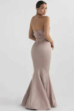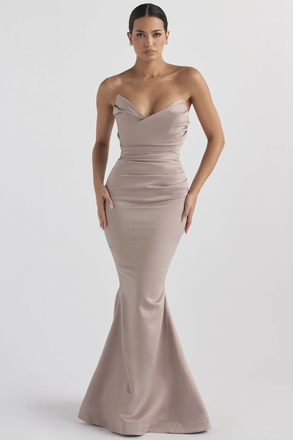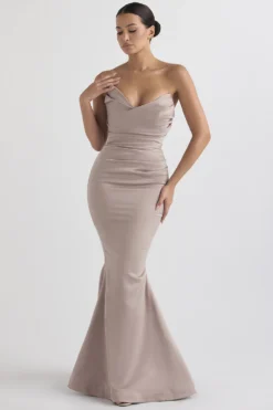 Our ‚Fleur‘ maxi dress is cut from our luxuriously soft duchess satin in a delicate mushroom hue and has a beautiful feminine drape. As part of our new bridal collection, ‚Fleur‘ will look so chic and elegant as a modern gown and is also perfect for Formals, Balls and Events. The strapless, peaked neckline is so elegant and has a boned bodice for structure and support to ensure it flatters every shape.