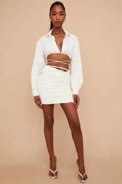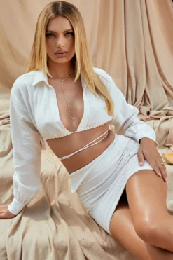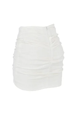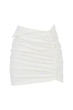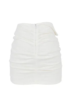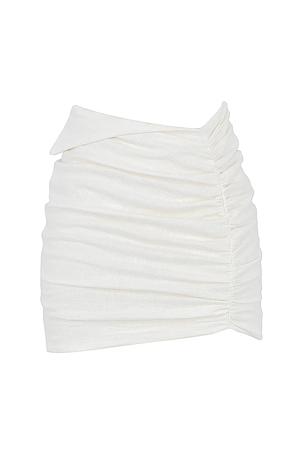 Our ‚Emmy‘ mini skirt dips to a folded waistband that’s reminiscent of 80’s silhouettes and has a strap to the front that sits on the natural waist. It’s made from a lightweight linen and has a flattering all over gather that’s cut to an asymmetric mini hem. ‚Emmy‘ is fully lined for comfort and has a zip to the back for easy on. Wear yours with our ‚Iris‘ Off White Wrap Around Cropped Shirt.