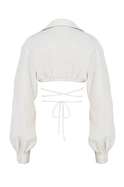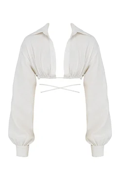 ‚Iris‘ has a distinct feminine feel, designed with crisscross ties to wrap around the waist and tie at the back. It’s made from a lightweight linen with an open plunge neckline and has a chic collar, voluminous long sleeves and cropped hem. ‚Iris‘ pulls on for easy on wear and is suitable for any bust size as it has no cups. Wear yours with our ‚Yara‘ Vintage Fit High Waist Jeans.