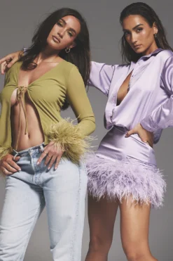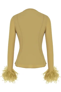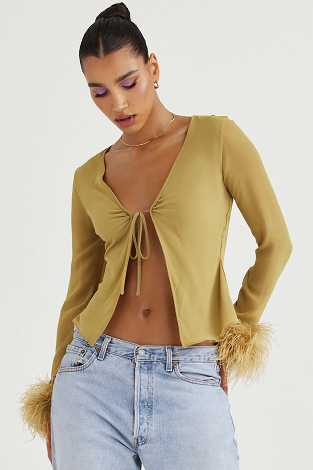 Our ‚Claudia‘ top has a revealing plunge neckline and cut from our lightweight georgette in a striking olive hue. The gathering at the bust is accentuated by the delicate tie front and gently flares from the waist. The long sleeves sit slim through the arms and the flouncy feather trimmed cuffs make it feel ultra glamorous. The body is fully lined for comfort. Wear yours with black trousers like ‚Erin‘ or pair with your favourite denim.