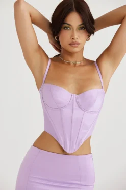 The delicate orchid hue is a spring season favourite and ‚Tamsin‘ is our pretty new addition. Cut from our lustrous duchess satin makes ‚Tamsin‘ so elegant, it features balcony underwired cups for uplifting cleavage and boned through the front and back to cinch the fit for a tiny waist.