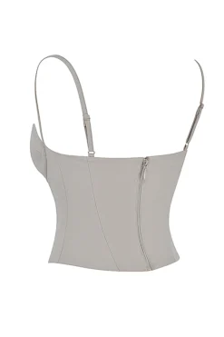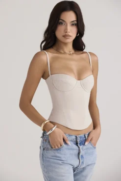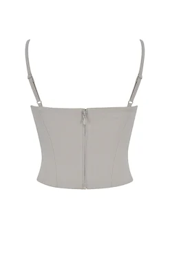 ‚Shanna‘ is simply elegant. Cut from a stretch crepe in a delicate oyster hue, it features a sweetheart neckline with lightly padded underwired cups to lift and shape the bust and a longline corseted bodice that dips below the natural waistline. The internal boning accentuates the shape and cinches the waist for a flattering hourglass shape.