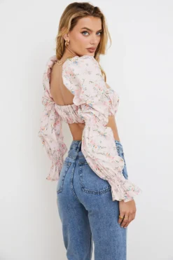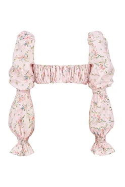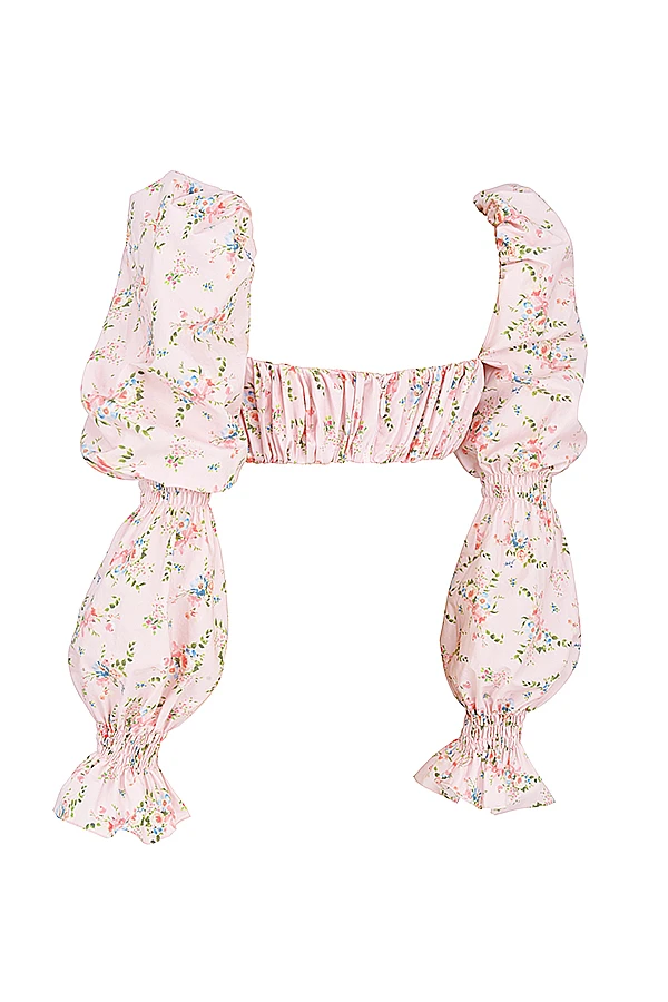 Cut from our crisp and fresh cotton poplin in a pretty pink floral, ‚Henrietta‘ is perfect for sunny days. It has a cropped bralette style that stretches for a secure fit and the pretty long sleeves are shirred to the wrist and elbows. The front has a drawstring to the bust and we love the pretty puff shoulders. The cups are fully lined for comfort and we think that ‚Henrietta‘ looks great with denim.