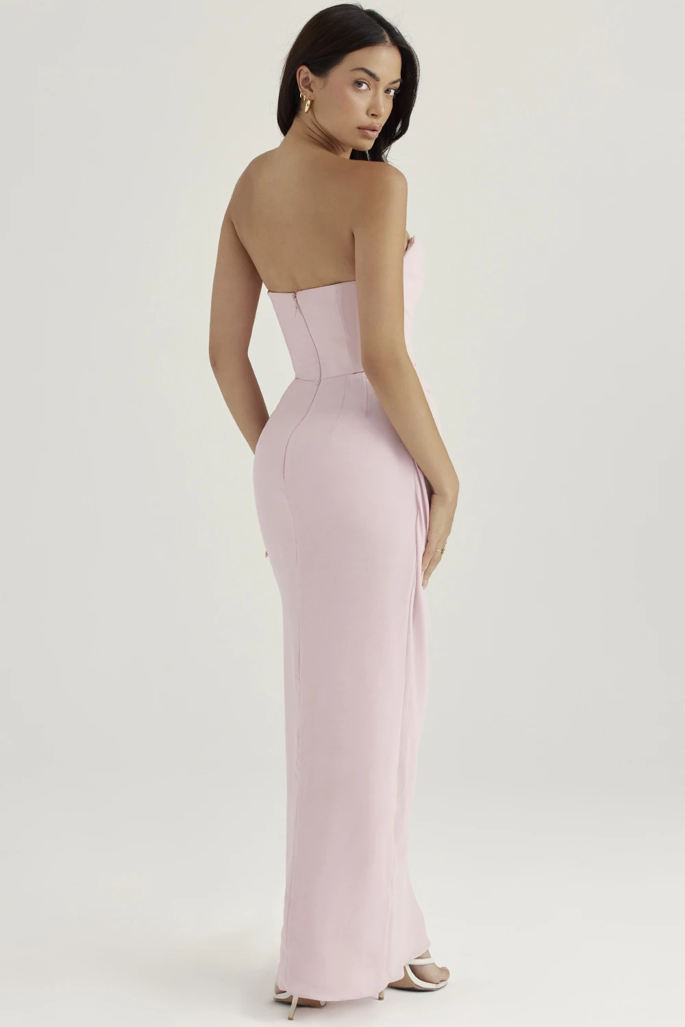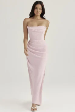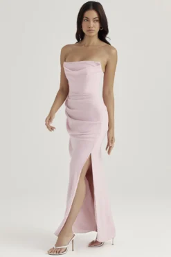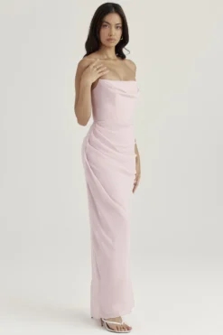 It’s all about feminine tones and languid, sexy drapes with ‚Adrienne‘. It’s cut from our lightweight georgette that drapes sexily across the bust and cinches the waist. The internal structure is specially boned for ultimate fit and support and the corsetry continues through the back and the sides. The bodice is cut in a balconette shape and sports our extra special side boob boning to give you ultimate uplift and cleavage and it’s lined with a textured fabric to provide a non slip effect.