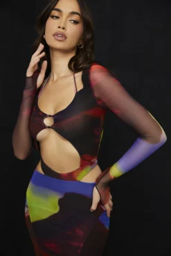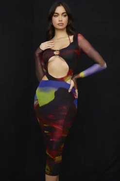 One of the anchors of our Black Orchid collection, ‚Marina‘ is beautifully sculpted with strategic cut outs to enhance your figure. It’s cut from a stretch mesh in our signature Black Orchid print and has our infamous powermesh to the inner layer that acts as shapewear within the dress for the smoothest most sculpting fit. It has a flattering midi length and we love the sexy cut outs to the front that add a dash of daring. Team yours with our opera length gloves for the most glam