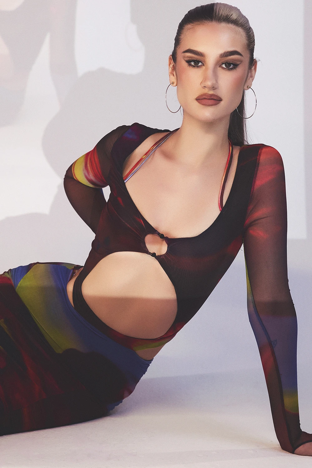 Materials: Soft Mesh Printed (85% Polyester, 15% Elastane) Light Silky Satin (100% Polyester) Soft Mesh Solid (80% Polyamide, 20% Elastane)