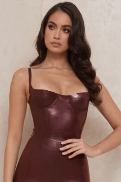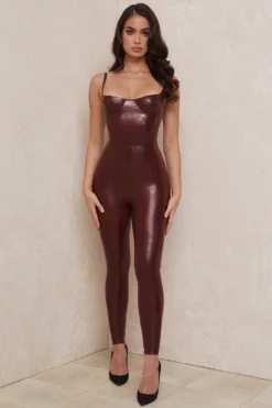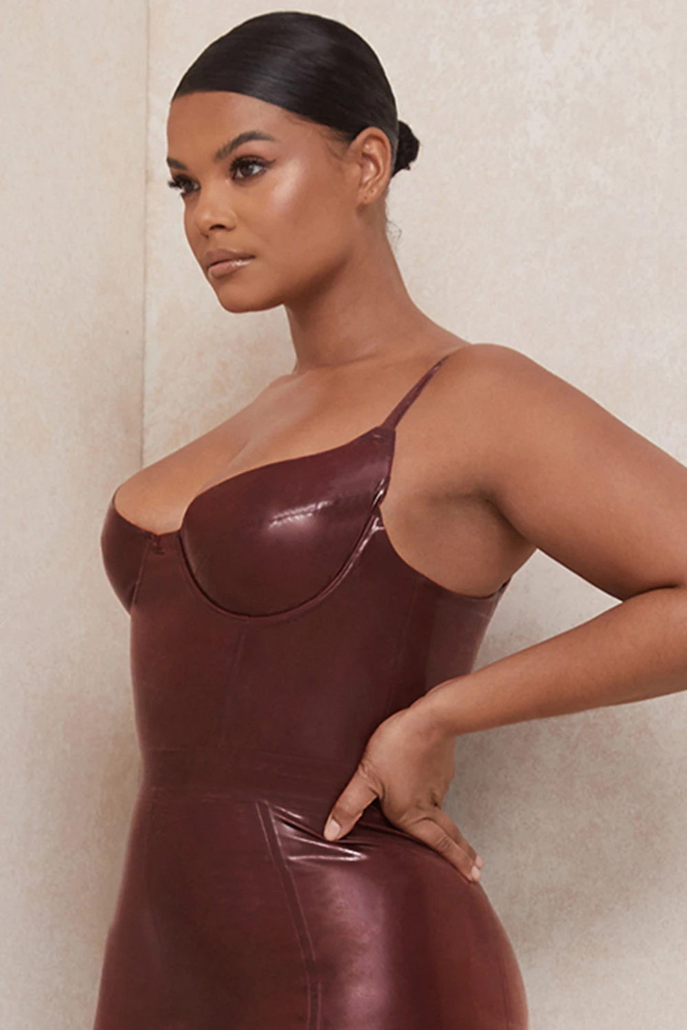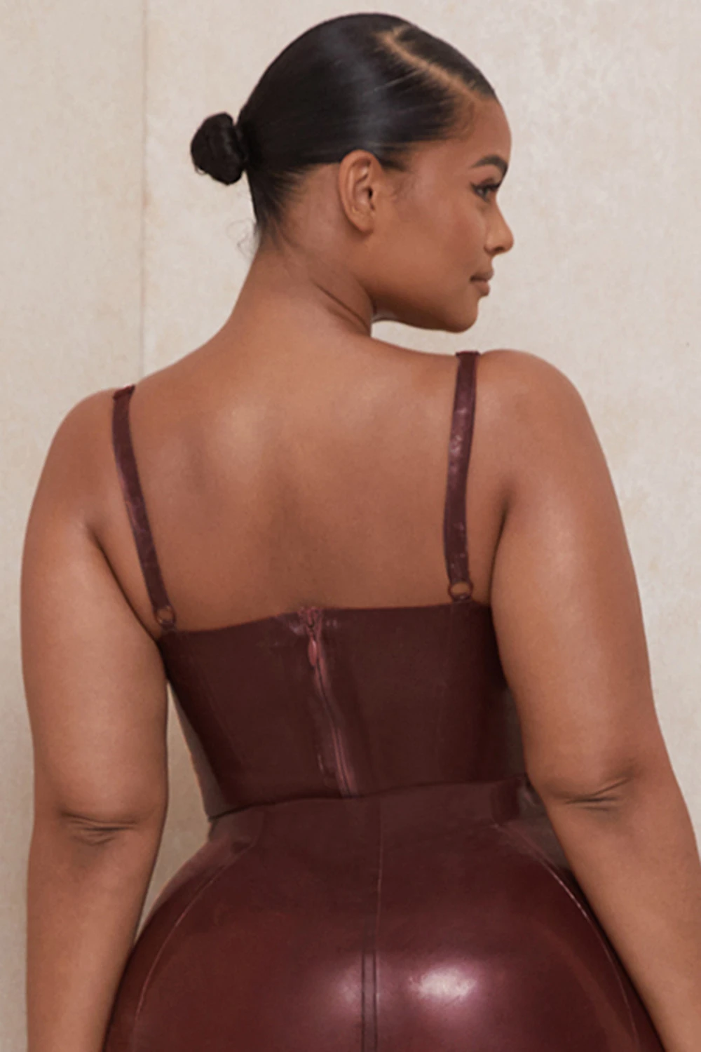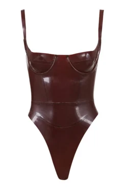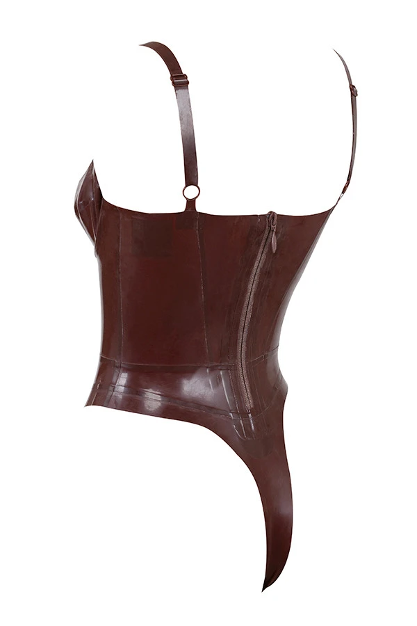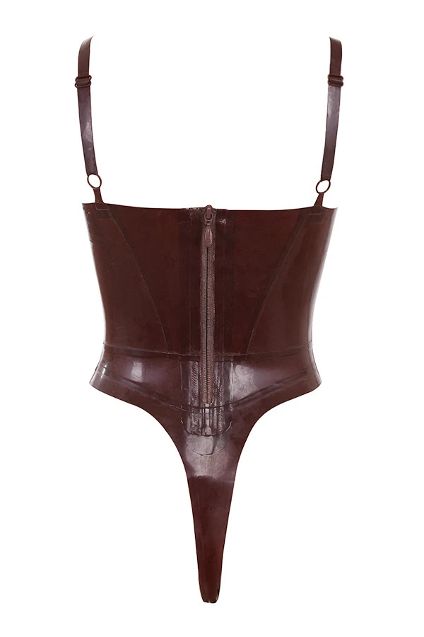 Our long awaited latex bodysuit has finally arrived. Cut from our super sexy latex in a rich glorious chocolate brown, ‚Tia‘ has a cupped bodice with an ultra flattering balconette cut. The straps are adjustable for the perfect fit and the thong cut ensures the smoothest of finishes. Wear yours under our ‚Lia‘ Chocolate Latex Pants for the ultimate head turning fit.