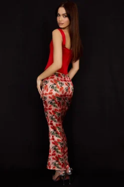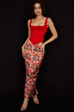 Our ‚Luisette‘ midi skirt is the kind of elegant, romantic style we think you’ll love as much as we do. ‚Luisette‘ is beautifully cut from a fluid silky satin in a romantic rose print that skims your frame and becomes slightly looser for a flattering drape across the body. It sits just below the natural waistline to rest on the hips and flares slightly below the knee with a delicate fluted hem. It zips up the back for easy on and is fully lined for comfort. Wear yours with our ‚Rafa‘ corset in scarlet for pretty date nights.