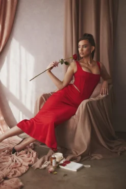 ‚Edetta‘ corset in scarlet and ‚Tao‘ sandals in scarlet.