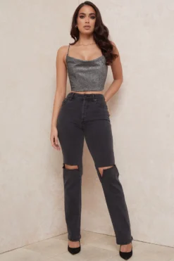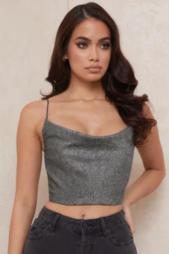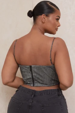 Simple yet ultra chic is our ‚Lulia‘ crop top featuring our special corsetry boning. It’s cut beautifully from a light-reflecting silver glitter crepe for a metallic vibe. The internal boning extends from the front, sides and round to the back which really lifts the bust to give the ultimate support in a super flattering balconette cut. The corsetry boning cinches the waist to really enhance the figure. The adjustable straps make it easy to find your perfect fit. Zips up the back for easy on and is fully lined for a smooth and comfortable feel. Wear yours with our ‚Grainne‘ Black vegan leather trousers and skinny heels.