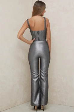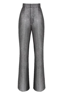 Add a touch of glamour to your wardrobe this season with our ‚Jas‘ Flare Trousers. They are beautifully crafted from our super sparkly glitter crepe. The waistband sits slightly higher on the natural waist and we love the flattering slim fit through the thighs to accentuate a leg lengthening silhouette before kicking out to flared hems. They fasten at the front and are lined to the knee in softly stretch satin for a comfortable smooth feel. Perfect for a glam weekend date. Wear yours with our ‚Emme‘ Black Ruched Chiffon Puff Sleeve Bodysuit & heels or with the coordinating ‚Hannah‘ corset for a full on metallic vibe.
