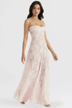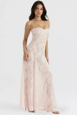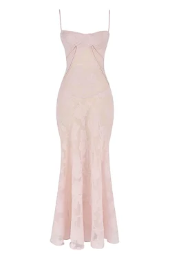 ‚Seren‘ is perhaps our most romantic dress yet and we’re loving the corset inspired lace up back for a vintage feel. It’s from a glistening lame fabric that catches the light beautifully in a soft pink, embellished with floral blooms. ‚Seren‘ features a built in bra that’s underwired for a flattering bust with delicate rouleau shoulder straps. The semi sheer effect adds to the romantic feel.