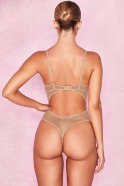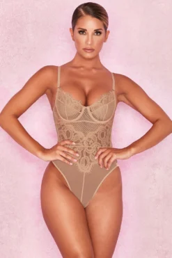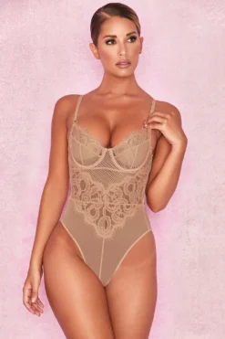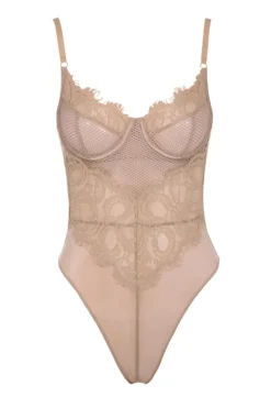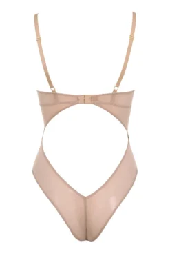 This gorgeous lace bodysuit combines feminine lace and a keyhole back. Crafted from tan lace and fishnet, ‚Nadia‘ has a cupped bust with mesh and lace to the front and back. The adjustable straps make for a perfect fit and the adjustable keyhole back is pretty and sexy. The cups are mesh with a layer of lace over. We’d suggest using our silicon nipple covers underneath if you prefer more coverage. Wear yours as outerwear with jeans or a pencil skirt.