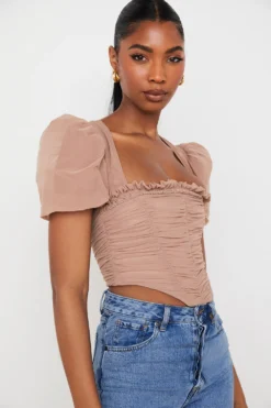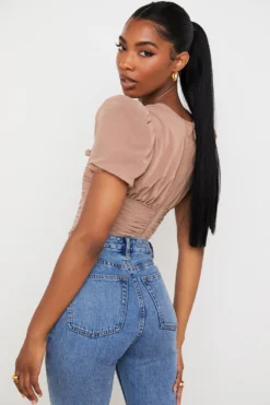 We love the pretty frill edging to the neckline and the dipped hem that hits just below the waistline. The fitted shoulders have a structured feel and the puff sleeves are fitted with an internal tulle booster to keep them sitting pretty. Style yours with a high waisted denim like ‚Tate‘ Blue Vintage Fit Antique Wash Jeans for a pretty date night.