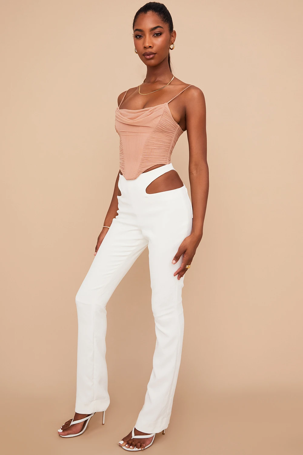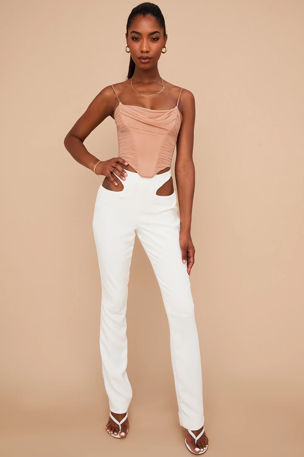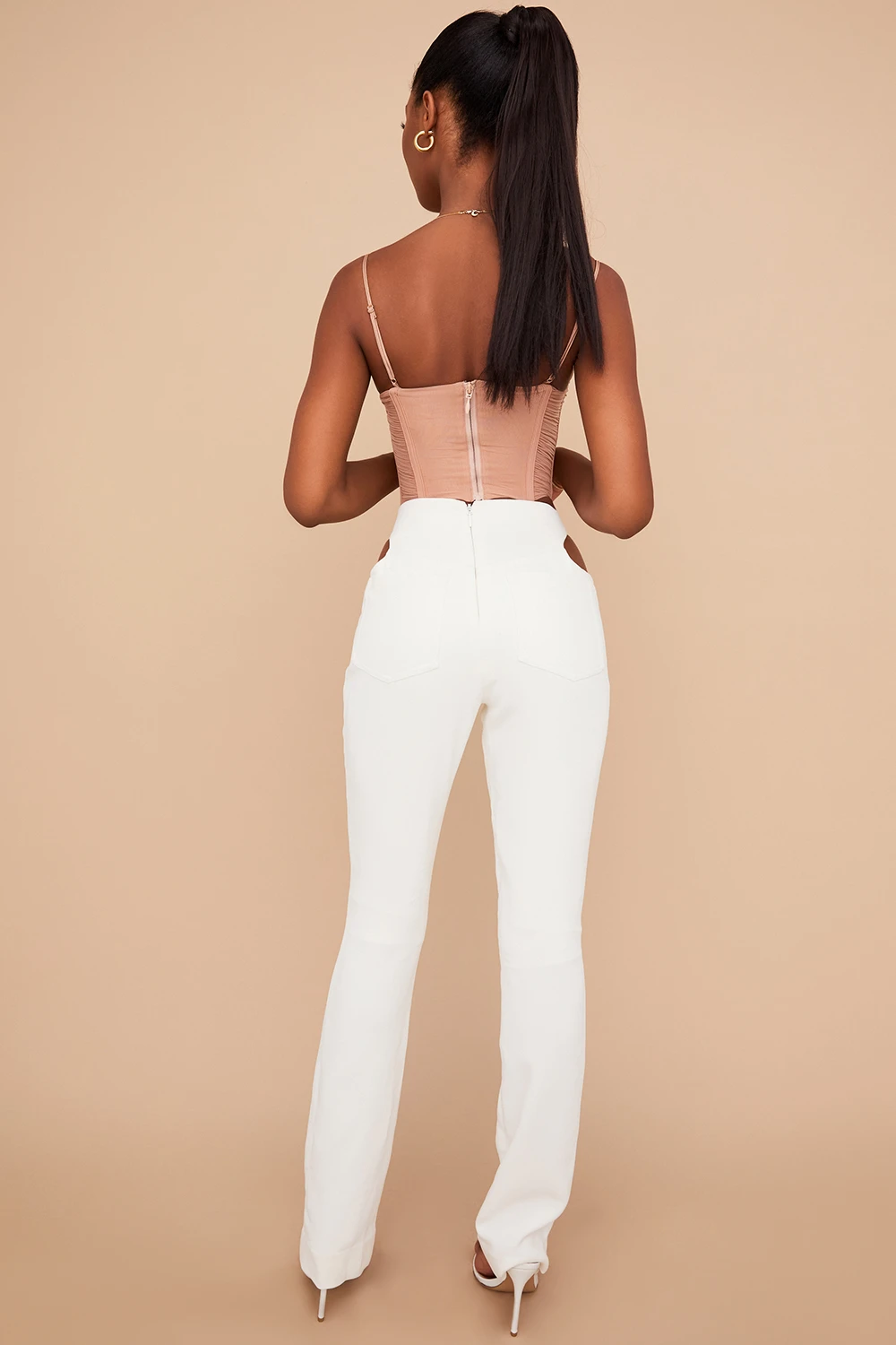 Unique design elements is what houseofcb is all about and our ‚Osaka‘ trousers are the perfect example. They are cut from a stretch crepe that has a distinctive wrinkled appearance and designed to flatter from every angle. ‚Osaka‘ are defined by scoop cutouts to the hips for a super sexy and feminine vibe with a curved waistband that sits comfortably at the natural waist with a zip to the back for easy on.