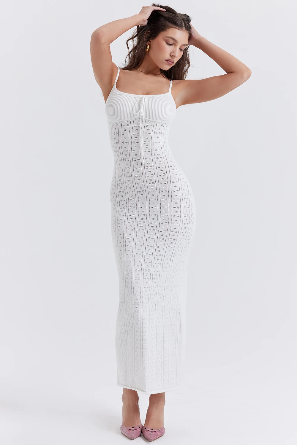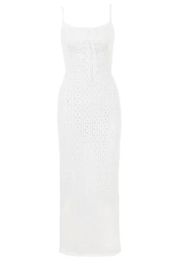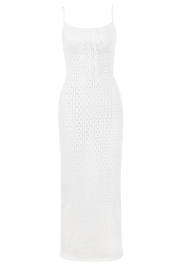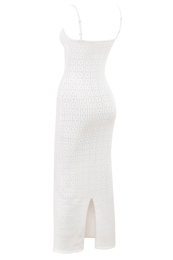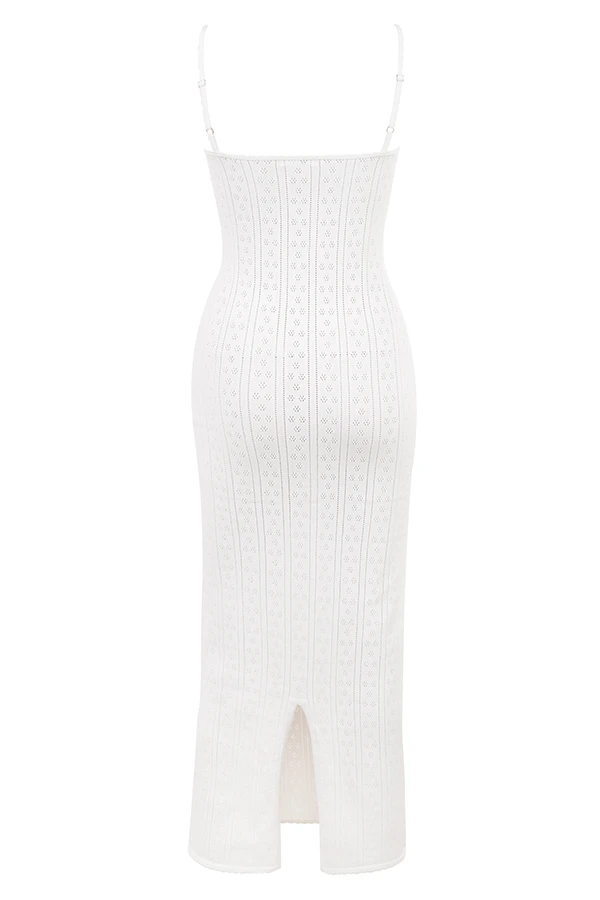 We love the ribbed panel to shape and highlight the bust and ‚Myla‘ pulls on for easy wear. The split to the back ensures easy movement. Wear yours with delicate heels like our ‚Lola‘ in white. We recommend folding our knitwear as it will stretch on a hanger.