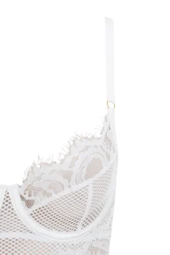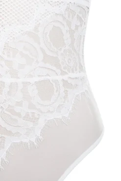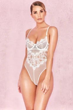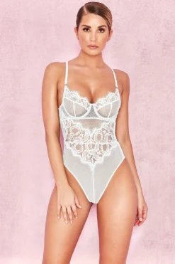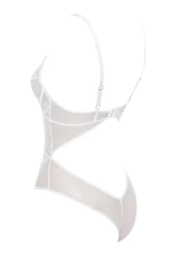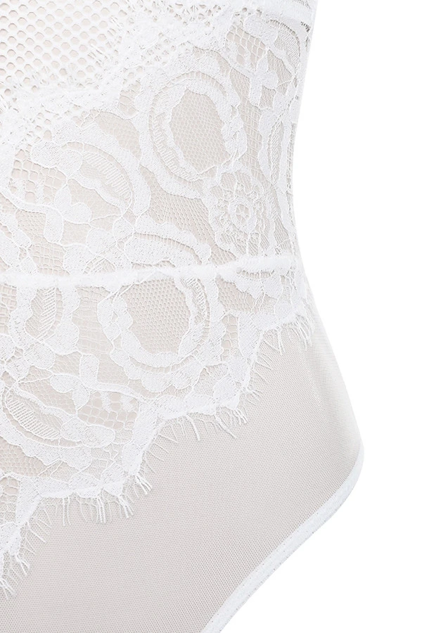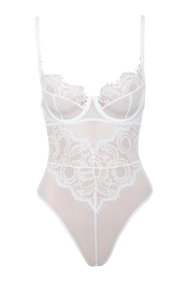 This gorgeous lace bodysuit combines feminine lace and a keyhole back. Crafted from white lace and fishnet, ‚Nadia‘ has a cupped bust with mesh and lace to the front and back. The adjustable straps make for a perfect fit and the adjustable keyhole back is pretty and sexy. Wear yours as outerwear with jeans or a pencil skirt.