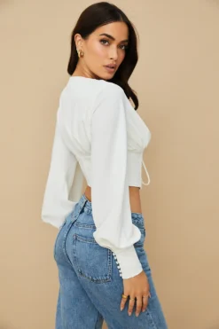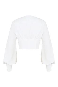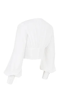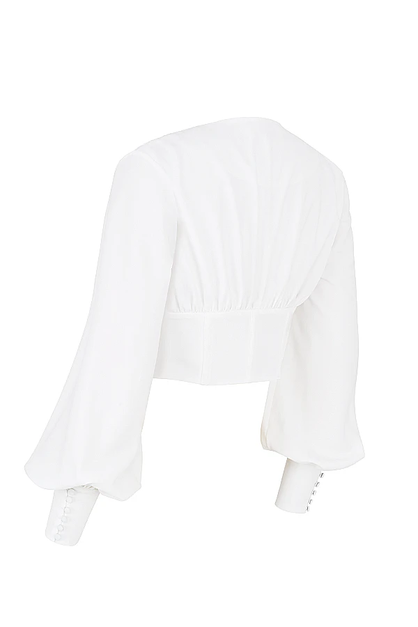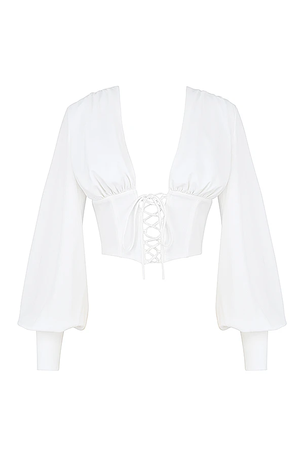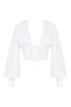 ‚Mirabelle‘ is your perfect go-to Summer top. It has an open neckline with a pleated bust and lace-up front that can be adjusted to reveal more or less skin. It’s made from a lightweight crepe in a delicate white and has romantic blouson sleeves with button cuffs to sit slim at the wrists. It has a zip to the left side for easy on and is fully lined for comfort. Wear yours with high rise denim like our ‚Yara‘ Vintage Fit High Waist Jeans. As corsets are designed to fit snugly, we recommend sizing up if you are between sizes.